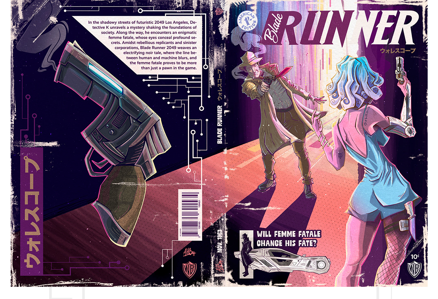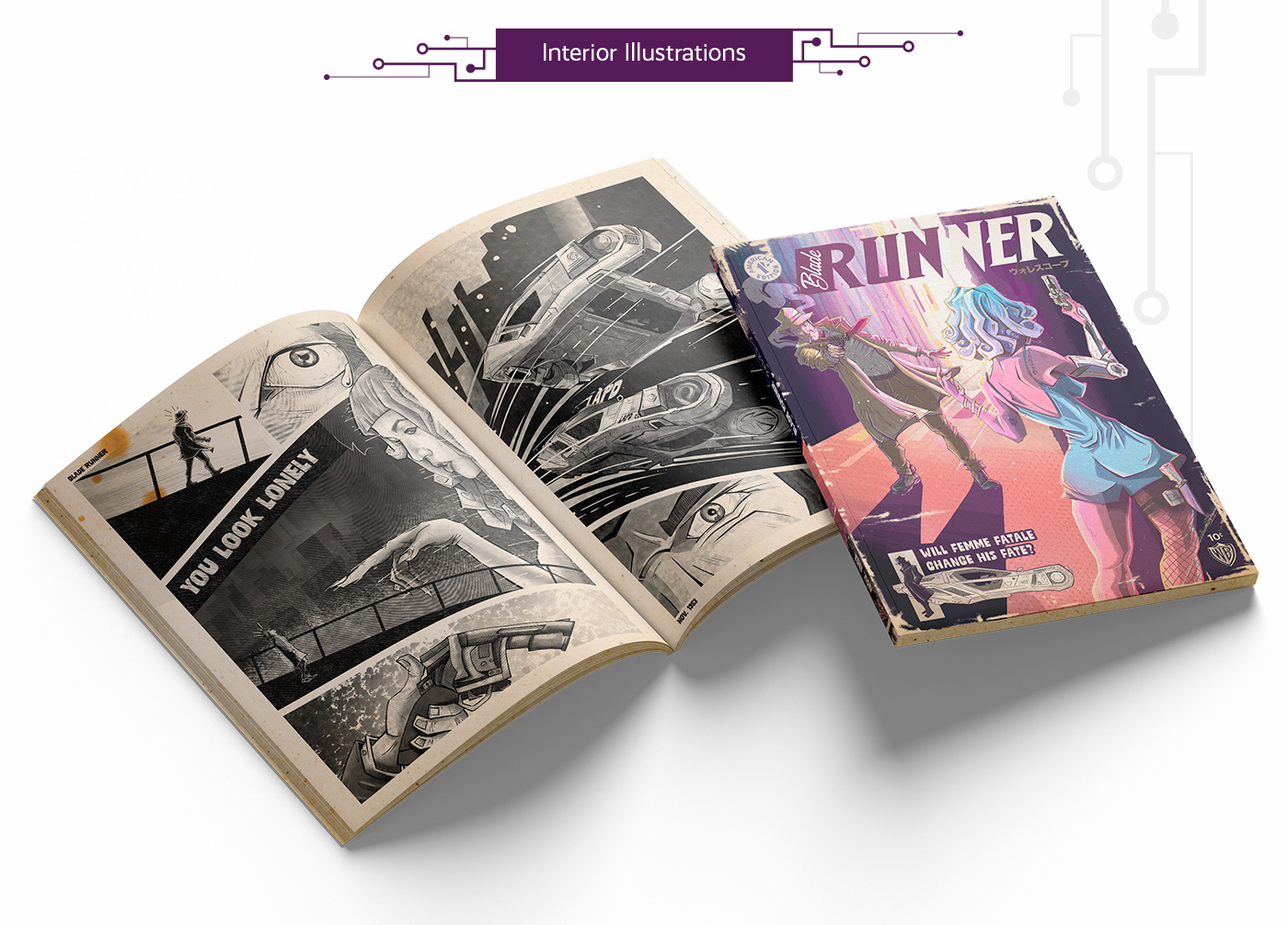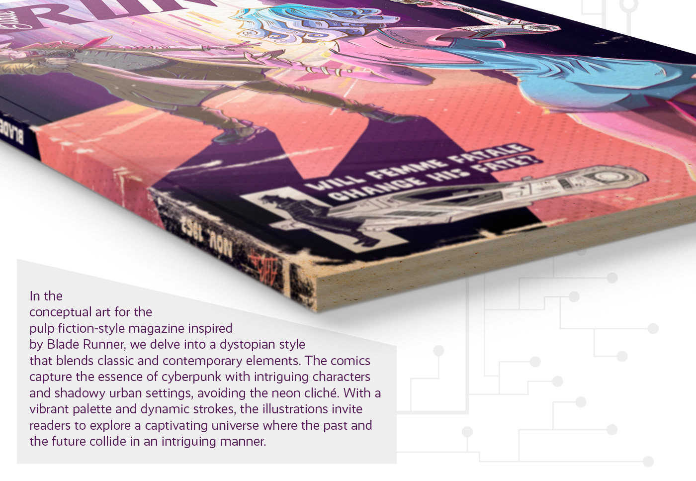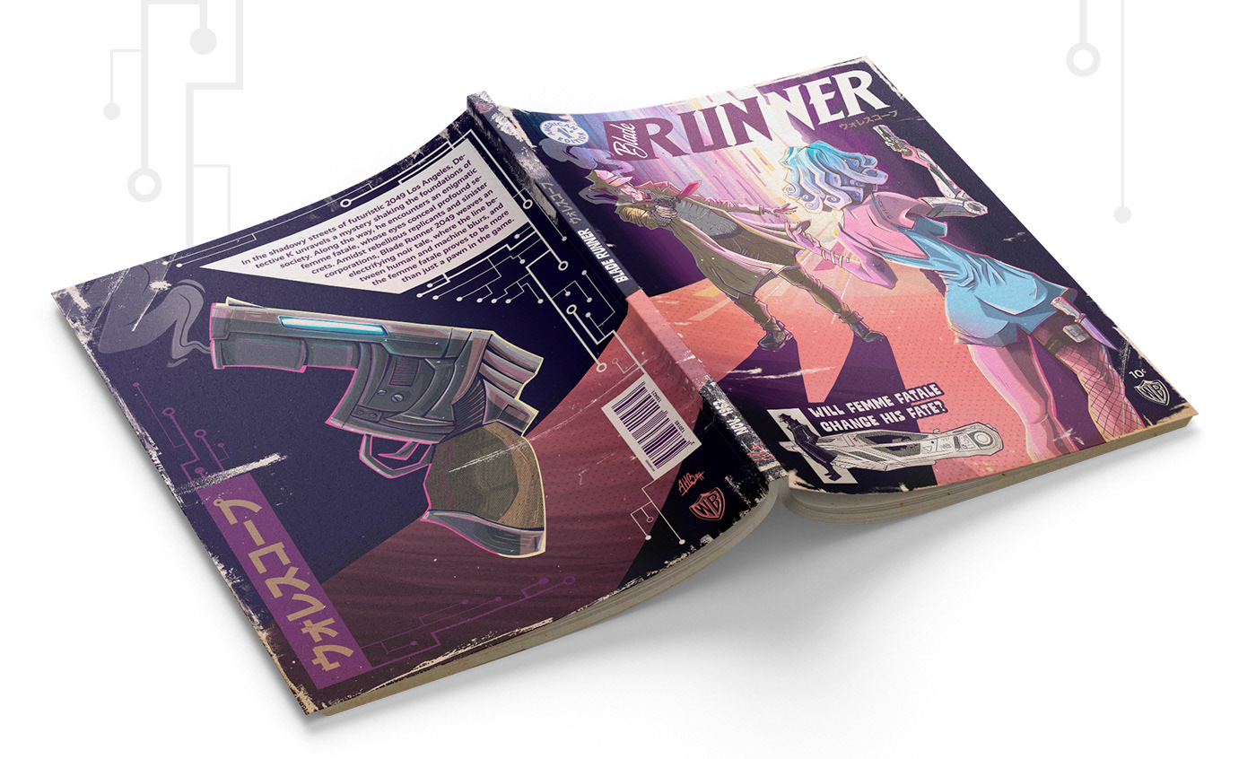 In the artwork for the Blade Runner-inspired pulp fiction magazine, we're mixing old-school and modern vibes. The comics show a cool, futuristic world with interesting characters and city scenes. Vibrant colors and lively drawings. It's like stepping into a captivating place where the past and the future come together in a really cool way.
