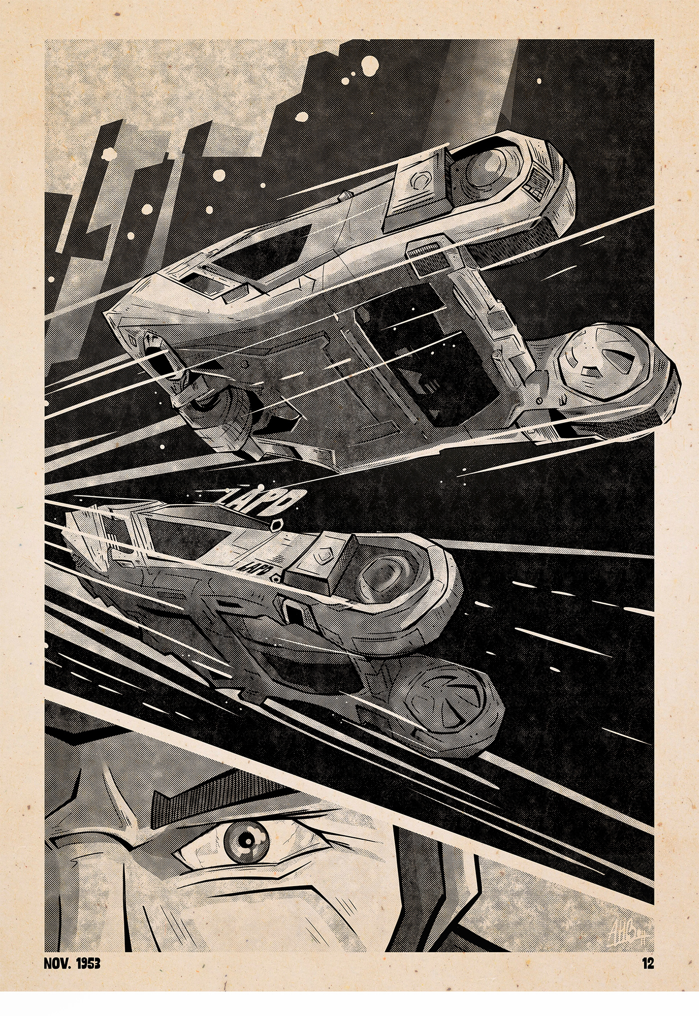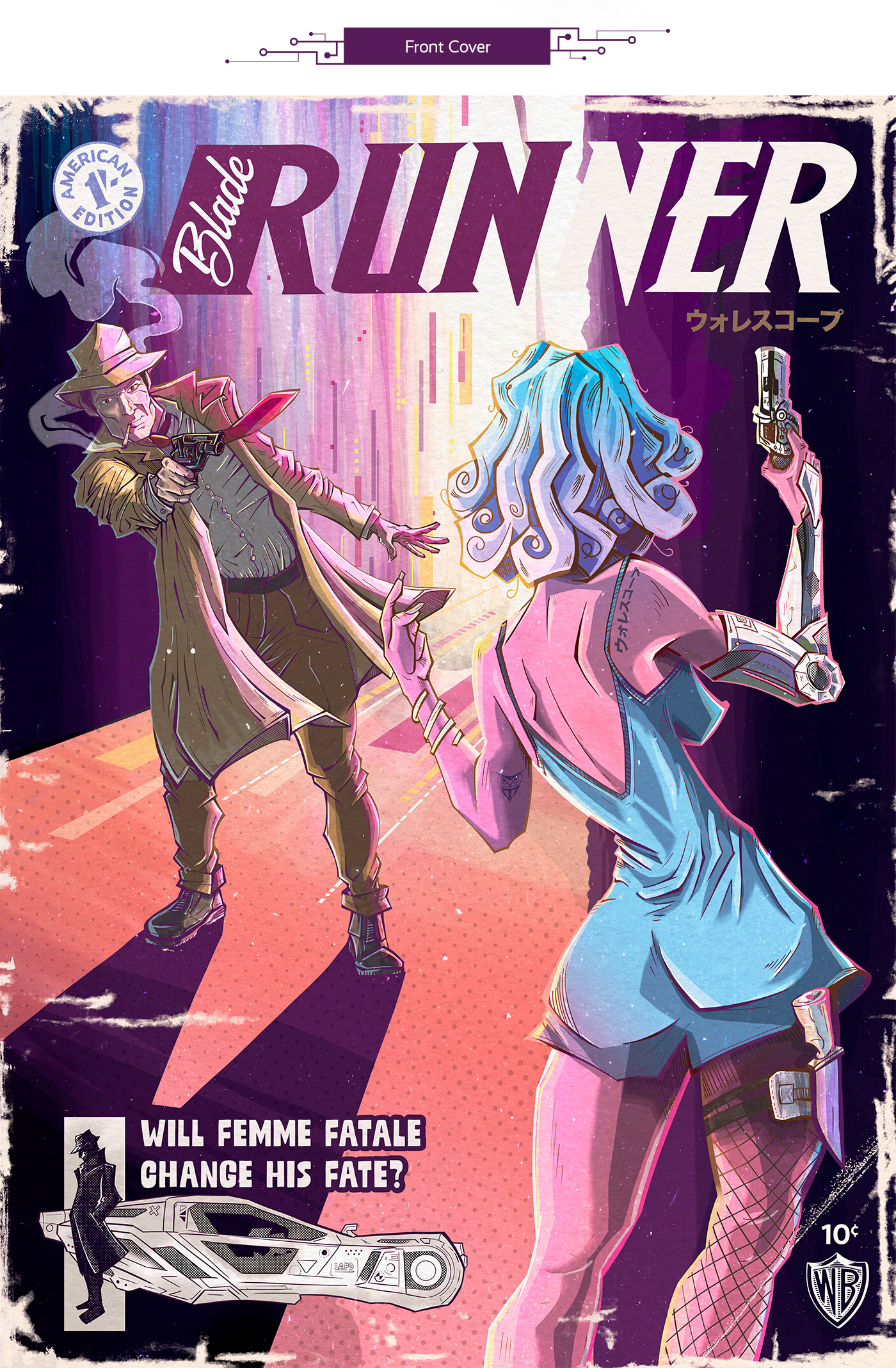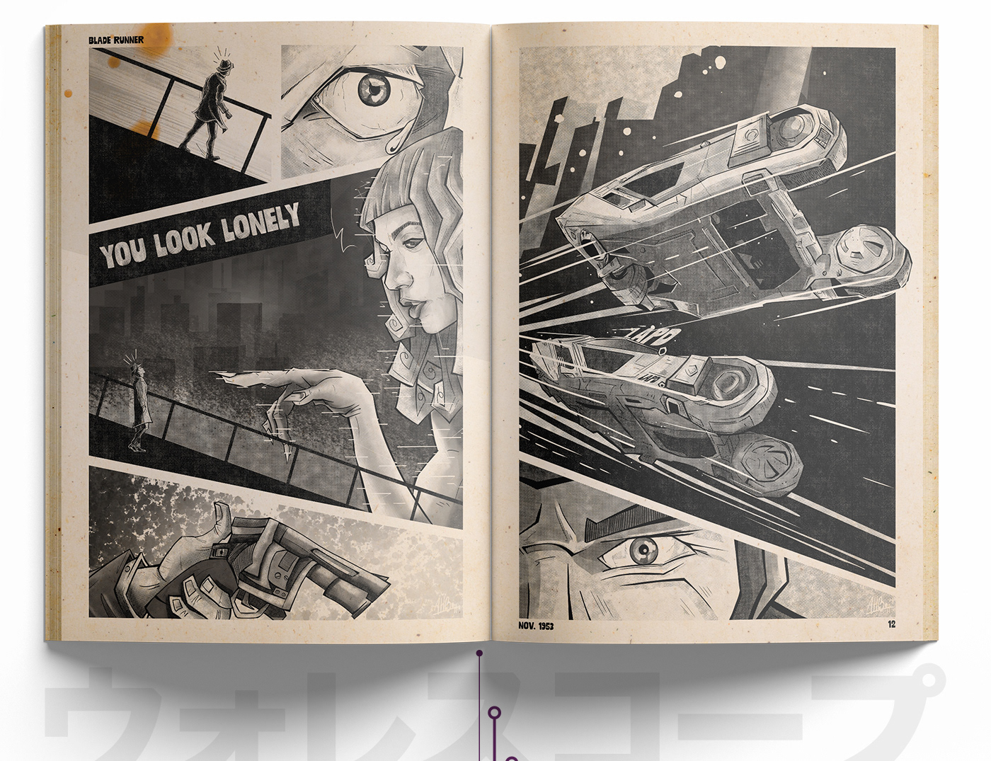 In the artwork for the Blade Runner-inspired pulp fiction magazine, we're mixing old-school and modern vibes. The comics show a cool, futuristic world with interesting characters and city scenes. Vibrant colors and lively drawings. It's like stepping into a captivating place where the past and the future come together in a really cool way.